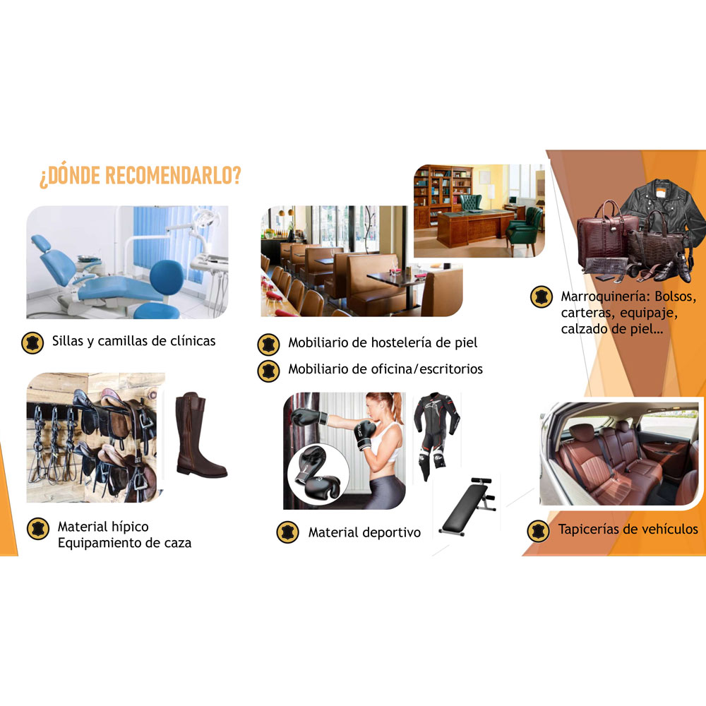 Especialmente recomendado para salones de estética y belleza, clínicas sanitarias y hospitales, mobiliario de hostelería y oficinas, hoteles, sector hípico y caza, gimnasios y centros deportivos, marroquinería, automóvil y re-venta en comercios de piel.