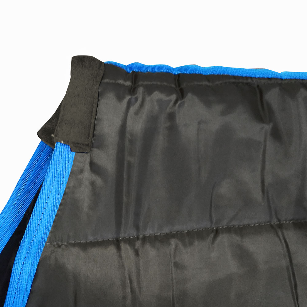 Acabado en ribete de nylon azul en contraste con el color gris de la manta: costuras reforzadas para mayor durabilidad y seguridad en su uso diario.