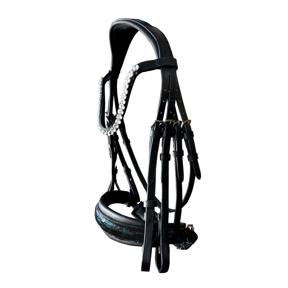 Muserola ancha y de suave acolchado, destacando el charol imitación en piel de serpiente en tonalidades negro, azul y verde. Ancho muserola: 5 cm.